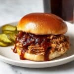 - Serve: Spoon the shredded, flavorful chicken onto buns and top with pickle slices for a perfect balance of heat, sweetness, and acidity. Serve immediately and enjoy.