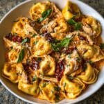 Reheat gently on the stovetop over low heat or in the microwave, stirring occasionally to ensure even warming without breaking up the tortellini. If the sauce thickened too much, add a splash of chicken stock or cream to loosen it back up.
