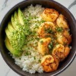 This Spicy Shrimp and Avocado Rice Bowl is a quick and flavorful meal featuring perfectly seasoned shrimp sautéed with a smoky chili spice blend, served atop fluffy rice and topped with fresh avocado, cherry tomatoes, red onion, and cilantro. Finished with a refreshing drizzle of lime juice and optional creamy tang from sour cream or Greek yogurt, it’s an easy, satisfying dish ready in just 20 minutes.