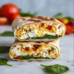 A quick and nutritious Spinach Feta Breakfast Wrap featuring fluffy scrambled eggs, fresh spinach, and tangy feta cheese, all wrapped in a warm tortilla. Perfect for a healthy and flavorful morning meal or on-the-go breakfast.