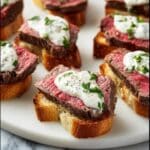 - Assemble the Crostini: Spread a generous dollop of horseradish cream onto each toasted baguette slice. Top with a slice or two of the cooked steak. Optionally, garnish with fresh herbs like parsley or chives for added color and flavor. Serve immediately and enjoy.