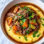 Besides polenta and mashed potatoes, creamy risotto, buttered egg noodles, or even crusty garlic bread work beautifully to soak up the luscious sauce from the pot roast.