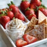 - Assemble and Serve: Arrange the cinnamon-sugar chips on a serving tray or platter. Serve the cheesecake dip and strawberry topping in separate bowls alongside for dipping and spooning onto the chips.