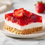 6. Add the Strawberry Topping: Hull and slice the fresh strawberries. Stir the sliced strawberries into the cooled room temperature Jell-O mixture. Pour and spread this strawberry gelatin mixture evenly over the chilled cream cheese layer.