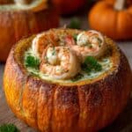 A hearty and elegant seafood dish featuring a creamy mix of shrimp, crab, and scallops cooked in a rich Parmesan sauce, served warm inside hollowed-out sourdough or Italian bread bowls. Perfect for a comforting meal with the crispy bread adding a delightful texture contrast.