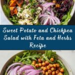 A vibrant and healthy Sweet Potato and Chickpea Salad with Feta and fresh herbs, featuring roasted sweet potatoes and chickpeas tossed with mixed greens and a zesty spiced dressing, perfect for a nutritious and flavorful meal.