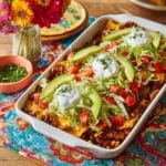 This hearty Taco Casserole combines seasoned ground beef, vibrant vegetables, black beans, corn, and melty Mexican cheese layered over crispy tortilla chips. Baked to bubbly perfection, it’s topped with fresh lettuce, pico de gallo, avocado, and other classic garnishes for a comforting and flavorful meal perfect for family dinners.