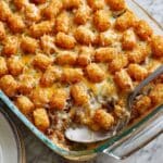 - Bake: Place the dish uncovered into the oven and bake for 35–40 minutes, or until the tater tots are crispy and golden brown.