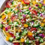 Because of the fresh vegetables and cheese, freezing The Perfect Greek Pasta Salad Recipe isn’t recommended, as it can alter the texture and taste. It’s best enjoyed fresh or within a few days refrigerated.