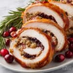 This Turkey Roulade recipe features a succulent boneless turkey breast rolled with melted Gruyere cheese and sweet dried cranberries, wrapped in its own skin for added moisture and flavor. Roasted to perfection with a crispy, golden skin, this elegant yet straightforward dish is perfect for holiday meals or special family dinners.