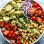 A vibrant and healthy Tuscan Artichoke Tomato Salad combining juicy cherry tomatoes, marinated artichoke hearts, chickpeas, and fresh herbs tossed in a flavorful red wine vinaigrette. Perfect for a light lunch or a side dish, this salad is quick to prepare and packed with Mediterranean flavors.