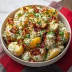 This Warm German Potato Salad features tender Yukon gold potatoes tossed in a tangy, savory dressing made with apple cider vinegar, Dijon mustard, and crispy bacon. Enhanced with fresh herbs and a hint of sweetness, this classic Bavarian side dish is served warm, making it perfect for comforting meals or festive gatherings.