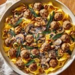 The crispy sage leaves are not just a garnish but a highlight that adds an herbal crunch, perfectly complementing the tender meatballs and creamy pasta. Toasted walnuts contribute a rustic nuttiness that contrasts beautifully with the richness of the sauce, while freshly shaved parmesan or romano adds a salty, tangy finish that ties the flavors together elegantly.
